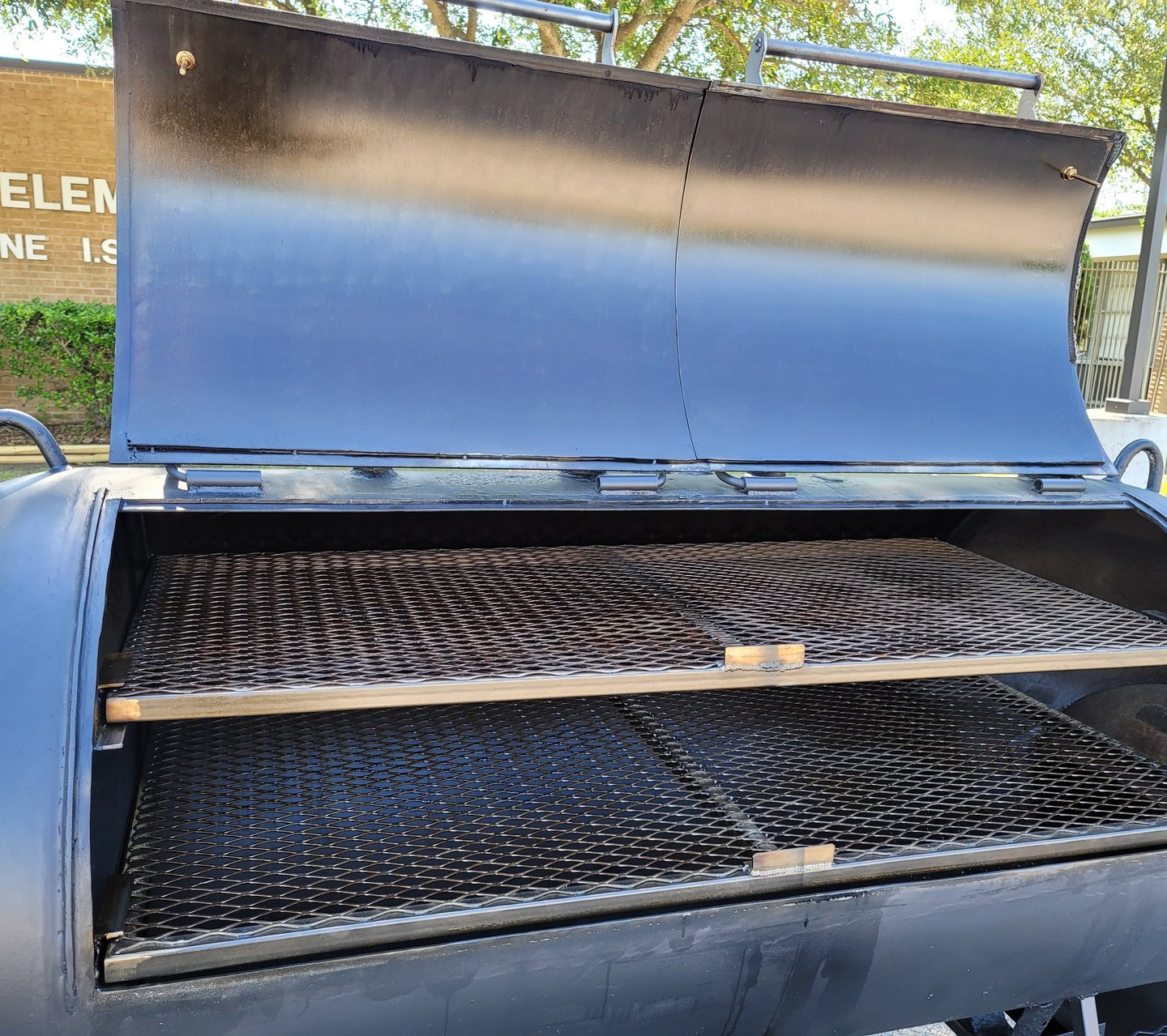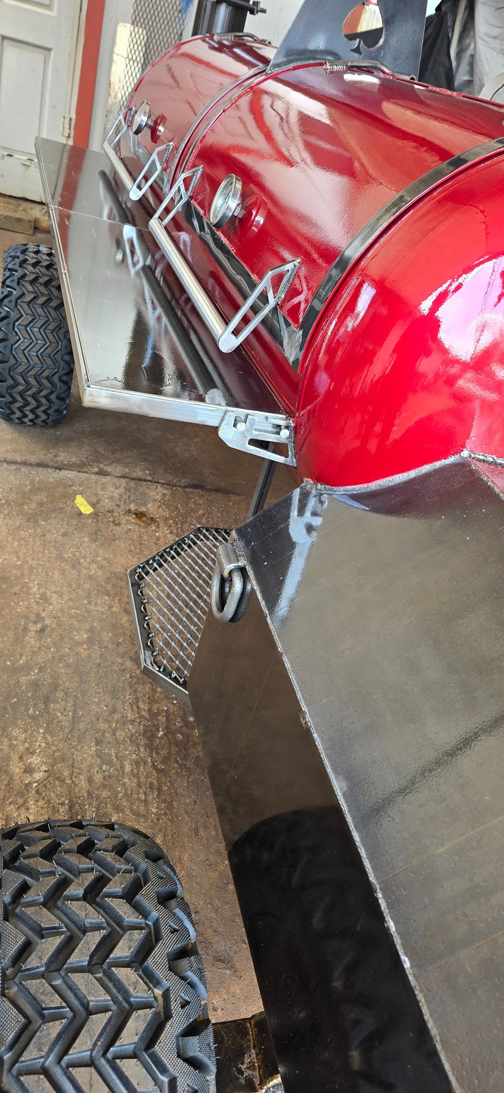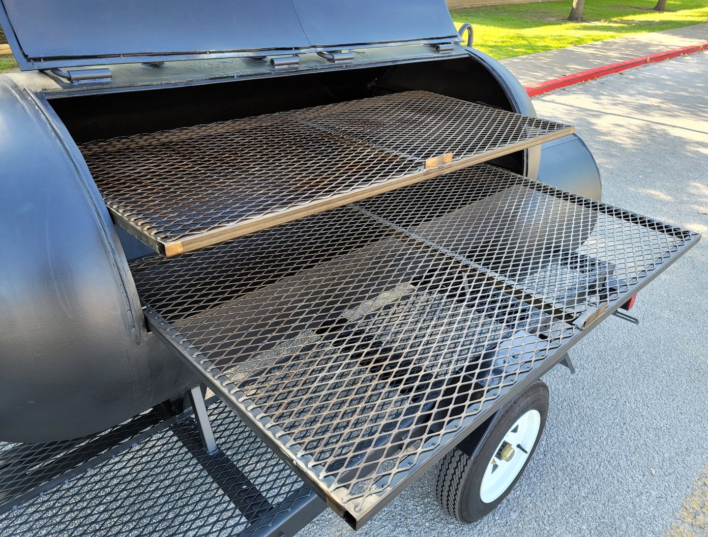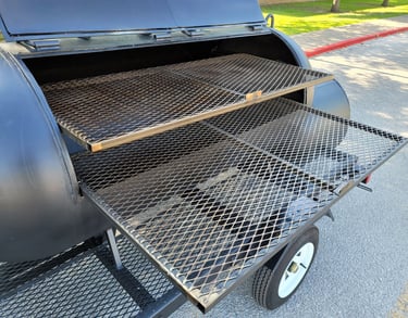 Removable bottom grates, Slide-out top grates, custom hinges, Two Tel- Tru thermometers, Fold -down stack, Stainless spinning handles, 23" tires, Heavy-duty custom axles.
