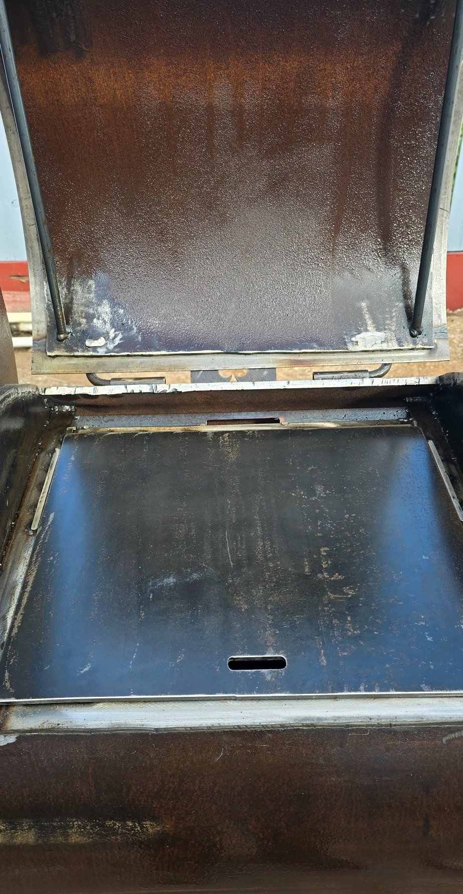 This one has two doors, but there's a twist! They overlap and, when opened, there isn't a middle bar. Great for smoking a whole pig!